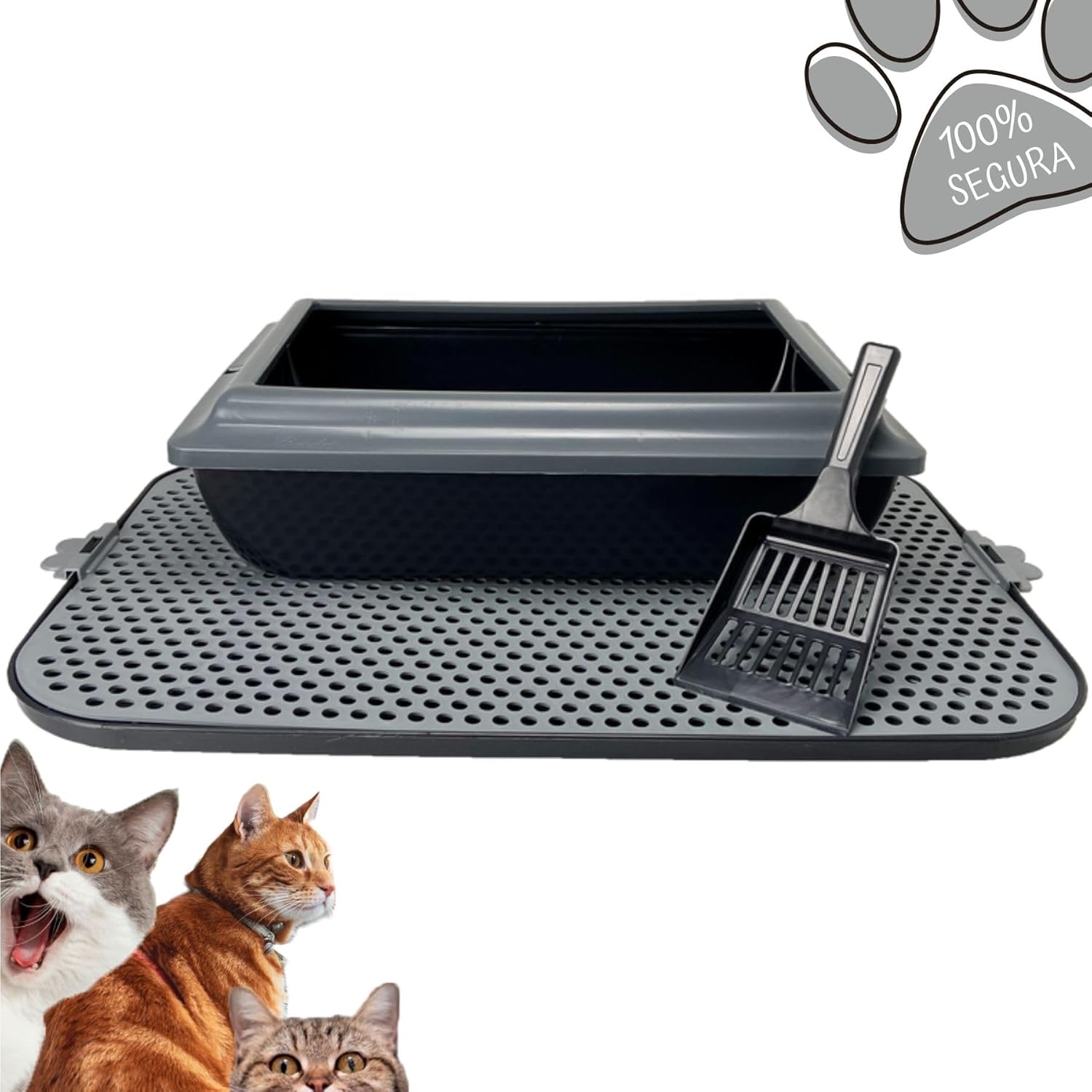 Caixa De Areia Para Gatos Borda alta Tapete Coletor Higiênico Anti Sujeira Grande (Preto e Cinza)
