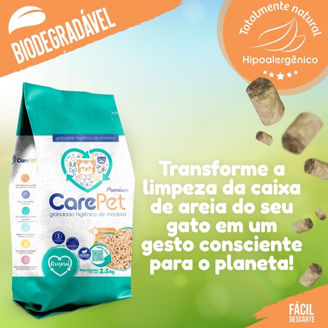 - Seguro e natural: Feito com materiais naturais, o granulado de madeira do CarePet é seguro para a saúde do seu pet e para o meio ambiente. Livre de produtos químicos agressivos, proporciona um ambiente mais saudável e sustentável para o seu animal de estimação.