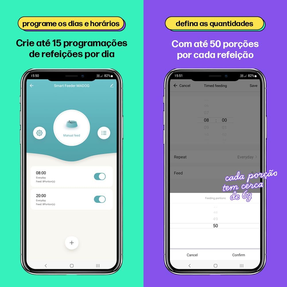 - Alimentação Saudável: Com a possibilidade de programar as porções de ração a serem servidas, você pode garantir que seus pets estejam seguindo uma dieta balanceada e adequada para suas necessidades nutricionais.