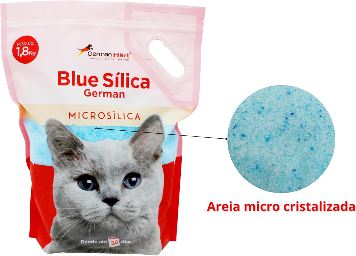 - Antiodor e Neutralizante: A Areia Higiênica Germanhart é formulada com cristais de microsílica azuis, que possuem a capacidade de absorver e neutralizar os odores da urina do gato, mantendo o ambiente sempre fresco e agradável.