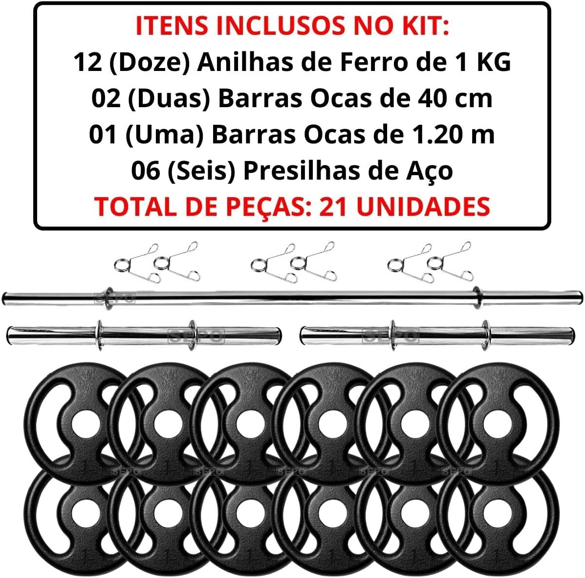 Kit 12Kg em Anilhas de Ferro com 2 Barras 40cm e 1 Barra 1,20m