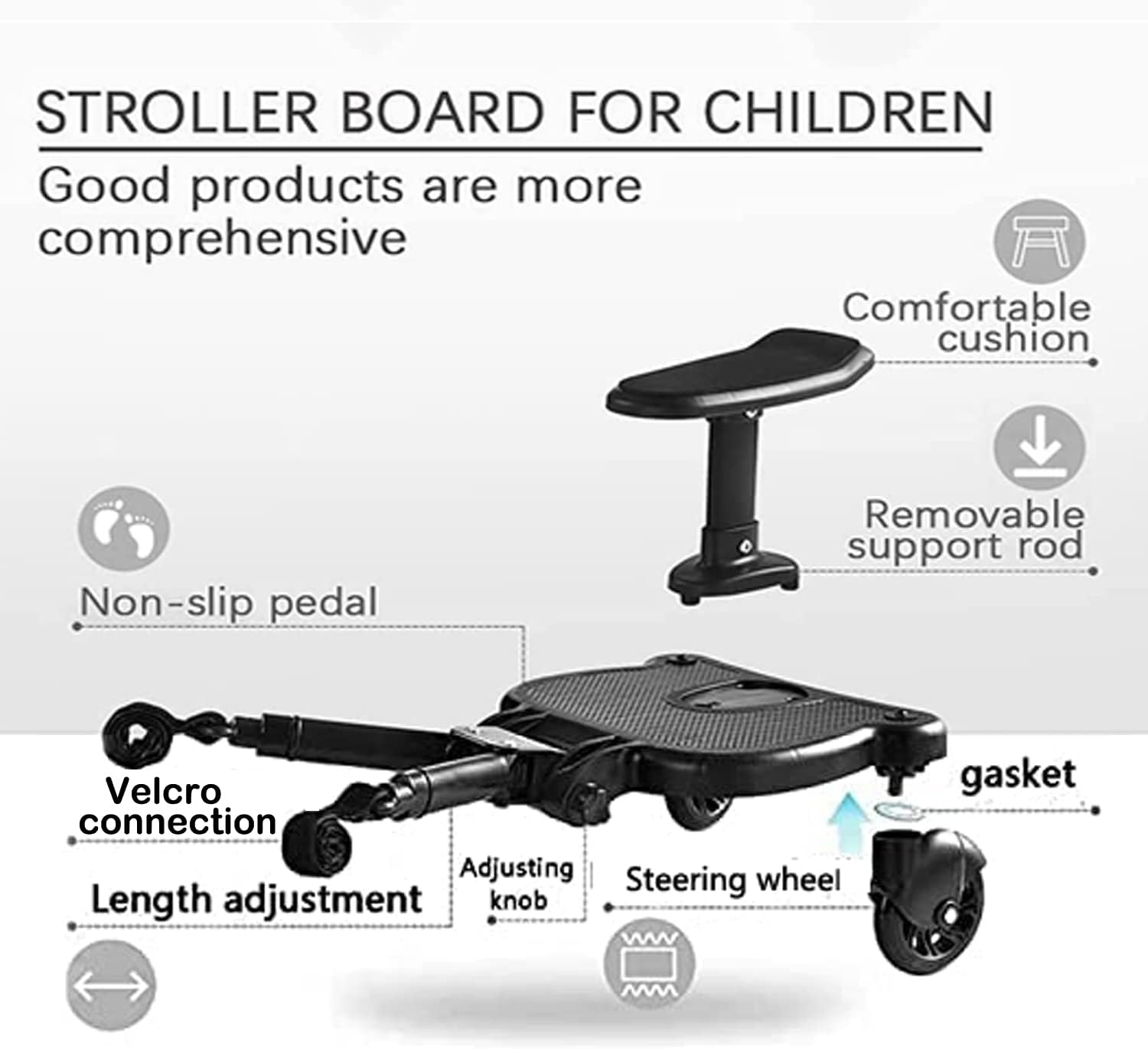 - Compatibilidade com a maioria das marcas de carrinhos: Não importa a marca do seu carrinho, a prancha universal se adapta facilmente a diferentes modelos, tornando-se uma opção acessível e versátil para famílias com crianças de idades diferentes.