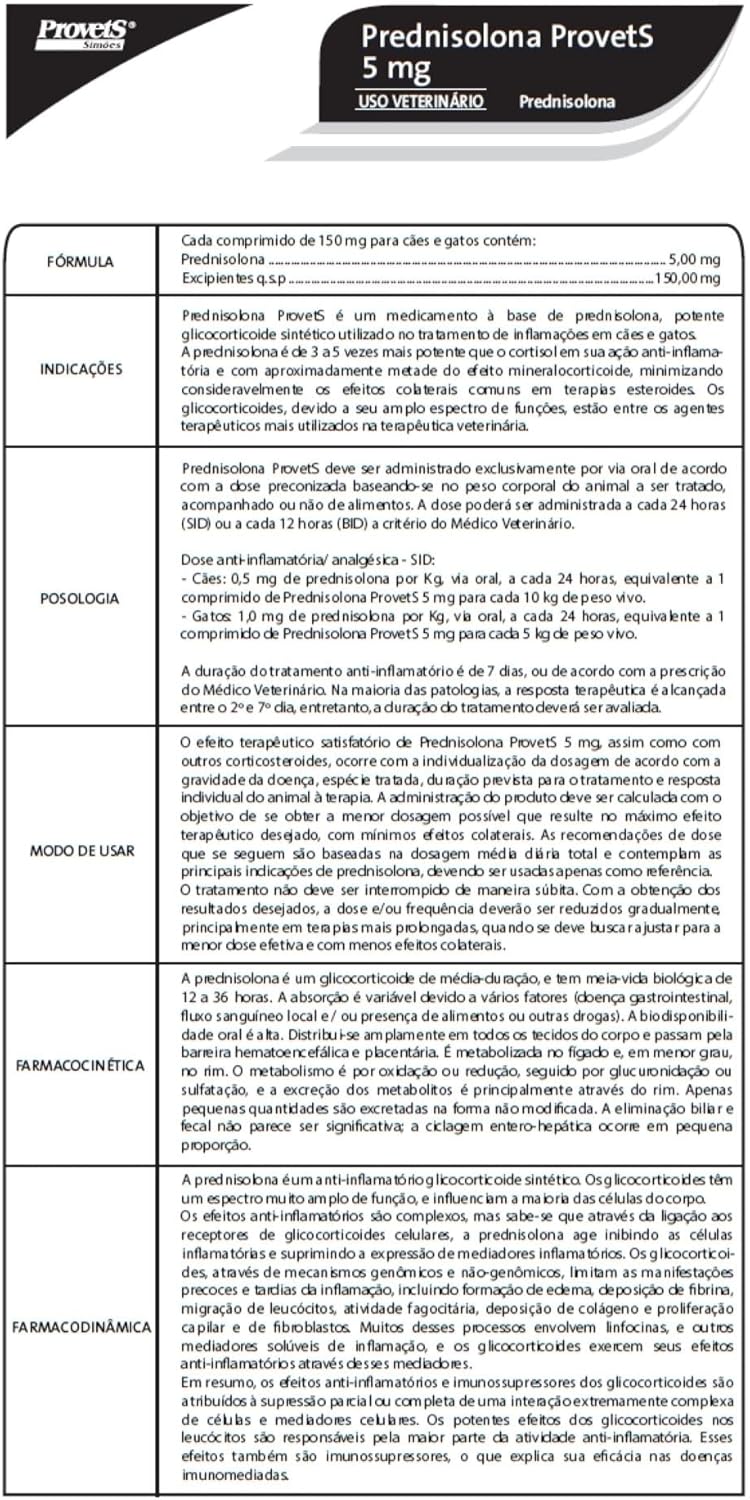 - Segurança para o seu pet: Desenvolvida pela marca Provets, a Prednisolona 5mg é um medicamento seguro e confiável, garantindo a saúde e o bem-estar do seu cão ou gato.