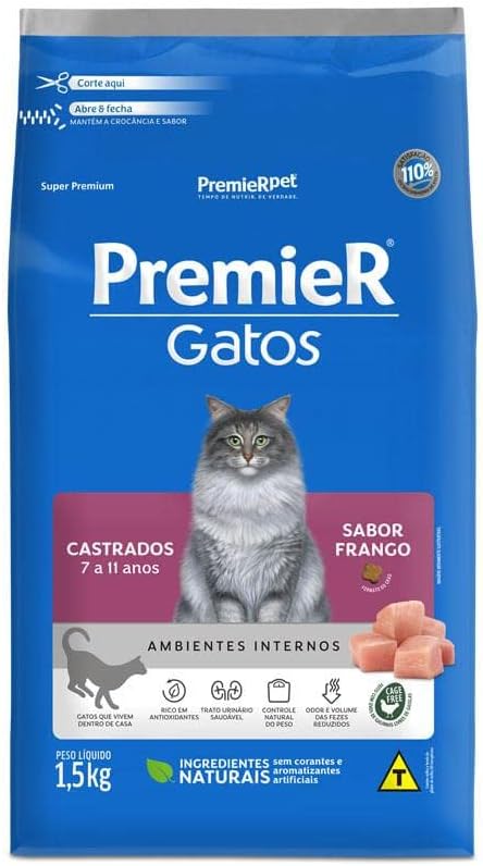 Premier Pet Ração Gatos Castrados 7 a 11 Anos Ambientes Internos Frango – 7,5kg