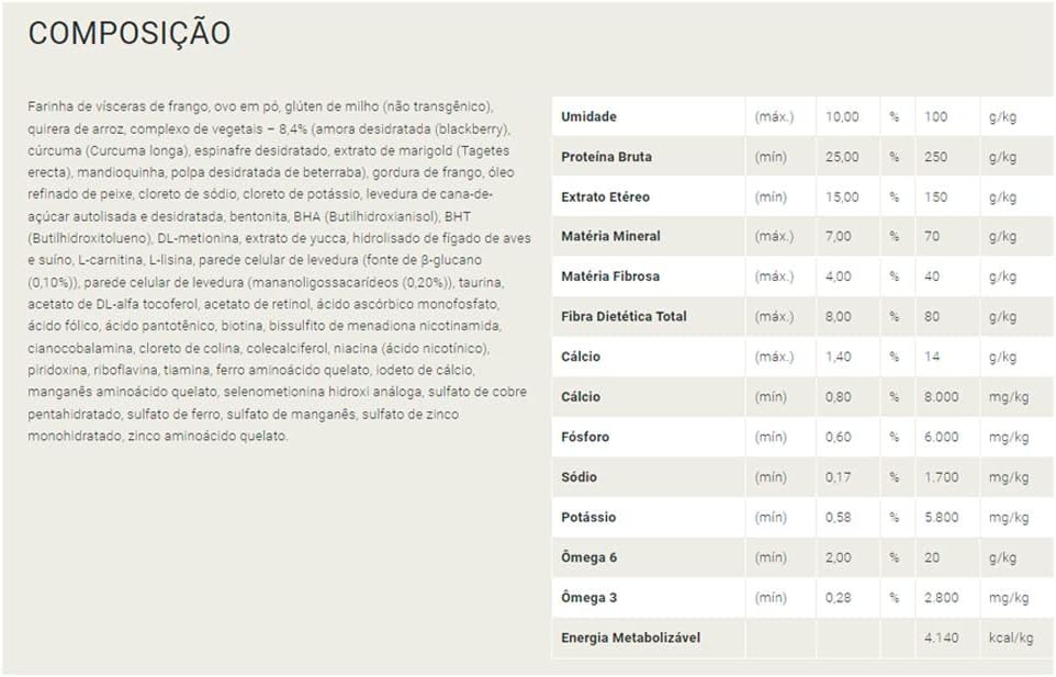- Sabor irresistível: Com a combinação de frango, mandioca, espinafre, cúrcuma e amora, essa ração oferece um sabor irresistível que vai conquistar até os paladares mais exigentes.