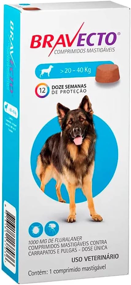 Bravecto Anti Pulgas e Carrapatos – Comprimido mastigável 1000 mg – Para cães com 20-40kg – Pacote com 2 Unidades